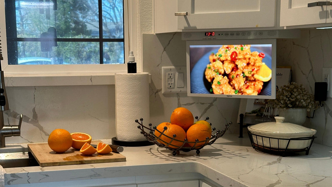 Upgrade your kitchen with our sleek under cabinet smart TV, designed for space-saving and versatile entertainment—perfect for a modern setup.